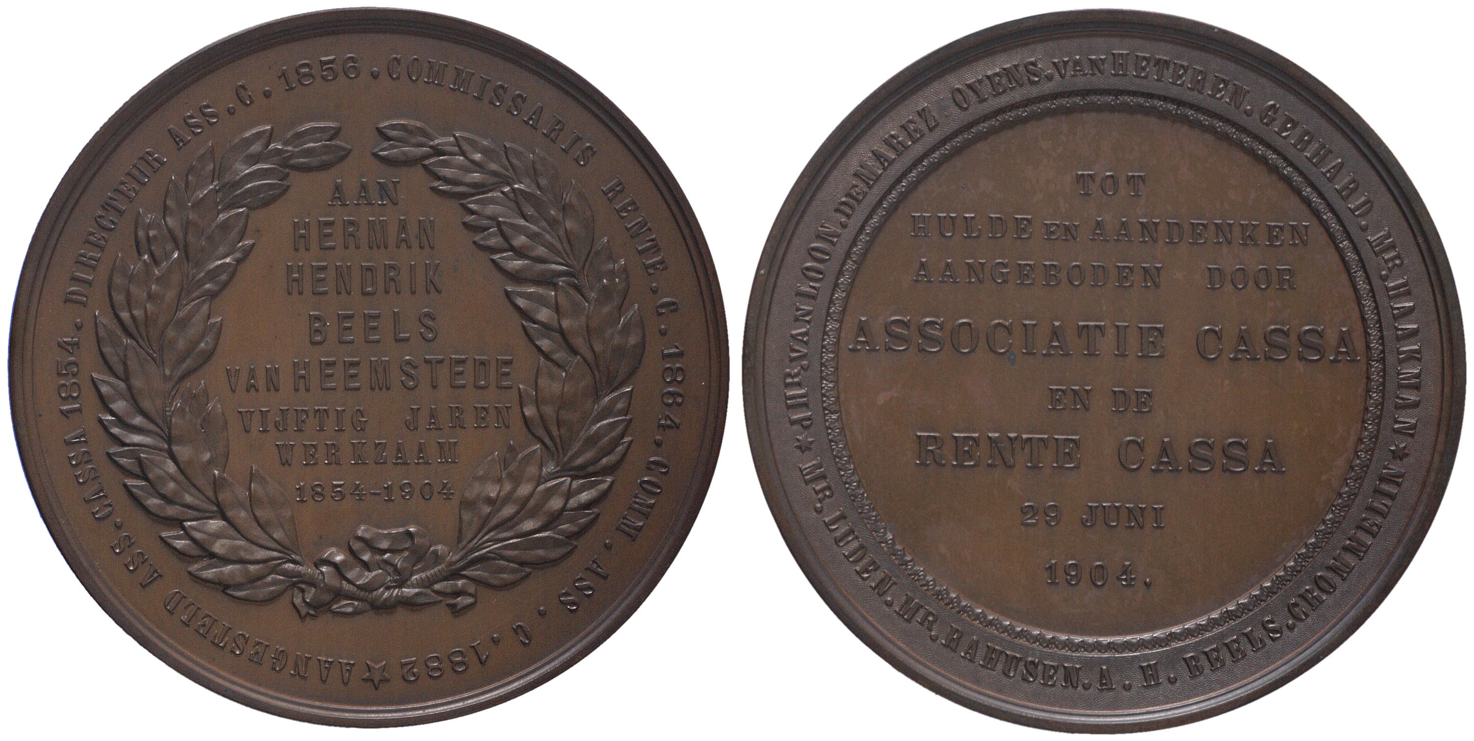 opschrift keerzijde: TOT / HULDE EN AANDENKEN / AANGEBODEN DOOR / ASSOCIATIE CASSA / EN DE / RENTE CASSA / 29 JUNI / 1904.