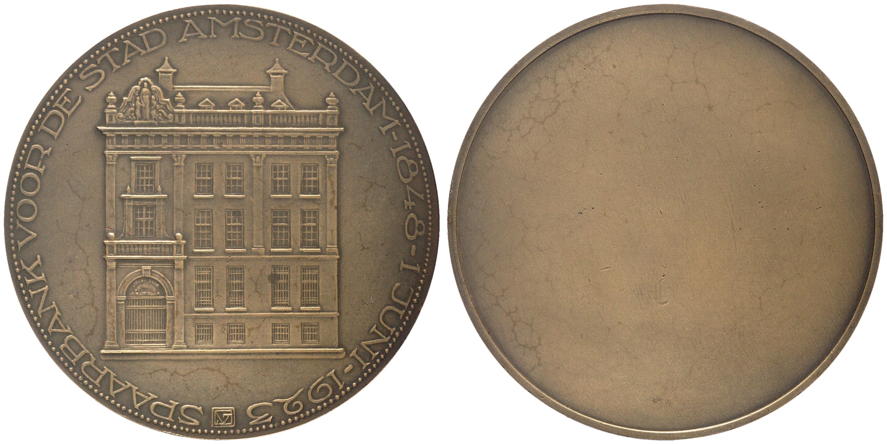 - omschrift voorzijde: SPAARBANK VOOR DE STAD AMSTERDAM - 1848 = 1 JUNI - 1925