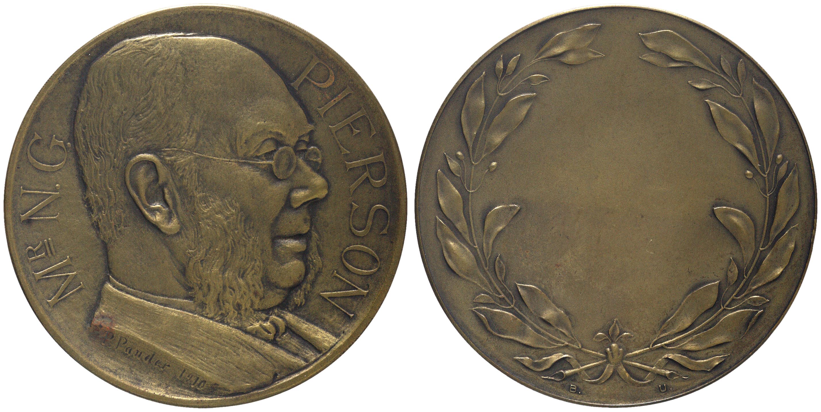 voorzijde: in een omschrift het naar rechts gewende borstbeeld van Nicolaas Gerard Pierson. Onder de kraag een signatuur. keerzijde: een gestrikte lauwerkrans waarbinnen een leeg veld.- Trefwoorden