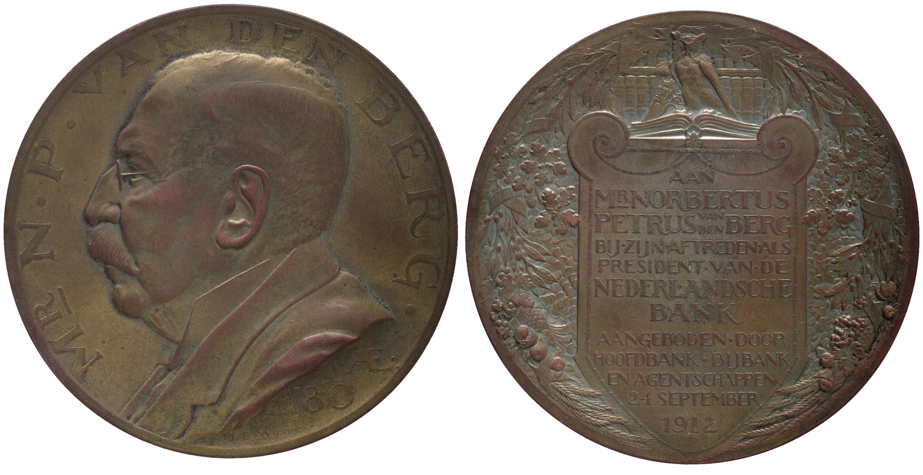opschrift keerzijde: AAN / MR NORBERTUS / PETRUS VAN DEN BERG / BIJ.ZIJN.AFTREDEN.ALS / PRESIDENT.VAN.DE / NEDERLANDSCHE / BANK / AANGEBODEN.DOOR / HOOFDBANK . BIJBANK / EN AGENTSCHAPPEN / 24 SEPTEMBER / 1912