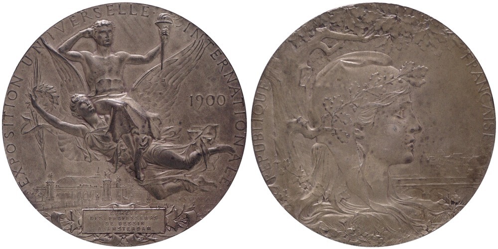 Beeld voorzijde: een gevleugelde vrouw op wier rug een man is gezeten met een brandende toorts in de linkerhand. Op de achtergrond de expositiehallen. Naast de vrouw het jaartal 1900.