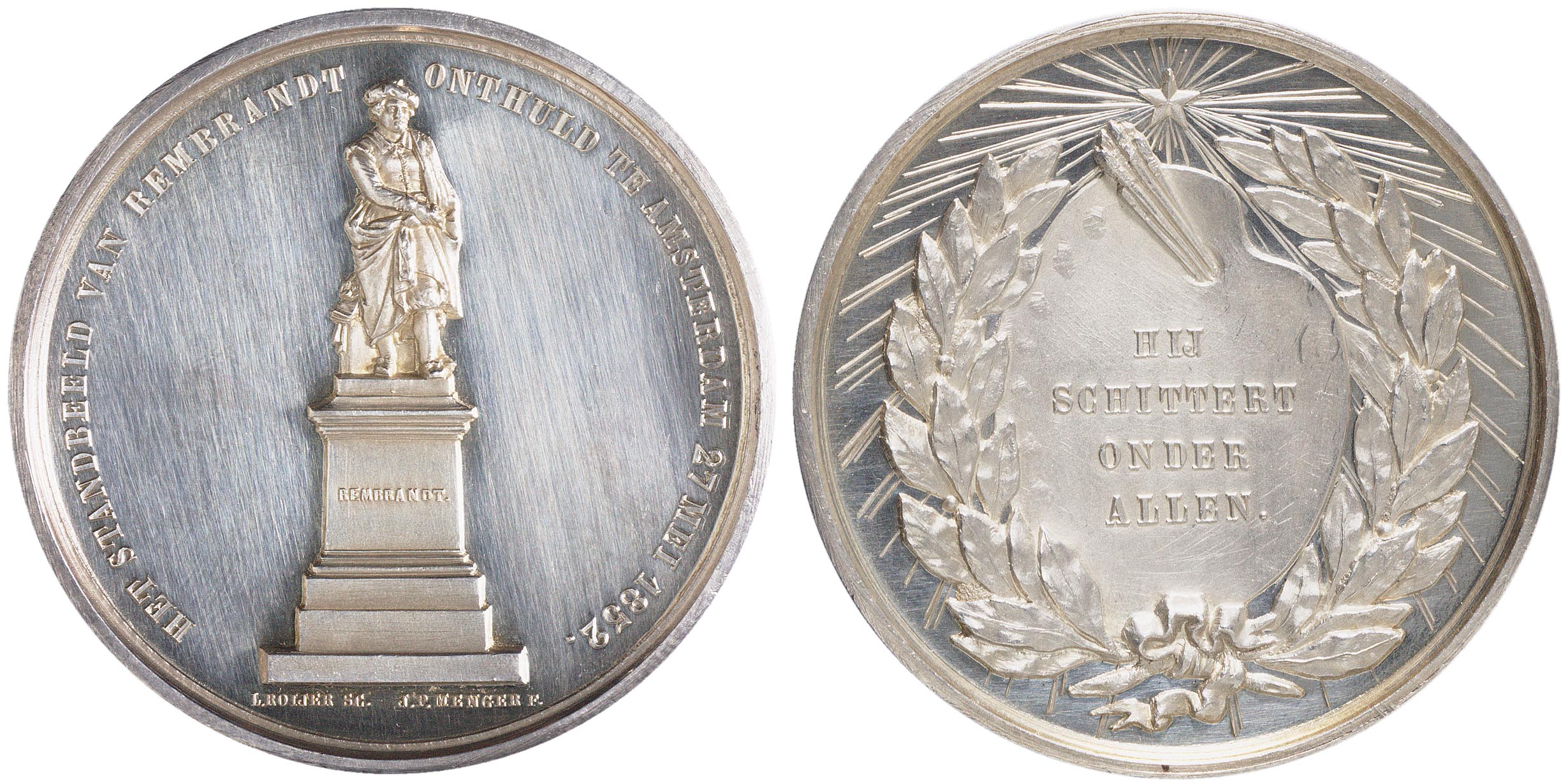 omschrift voorzijde: HET STANDBEELD VAN REMBRANDT ONTHULD TE AMSTERDAM 27 MEI 1852.