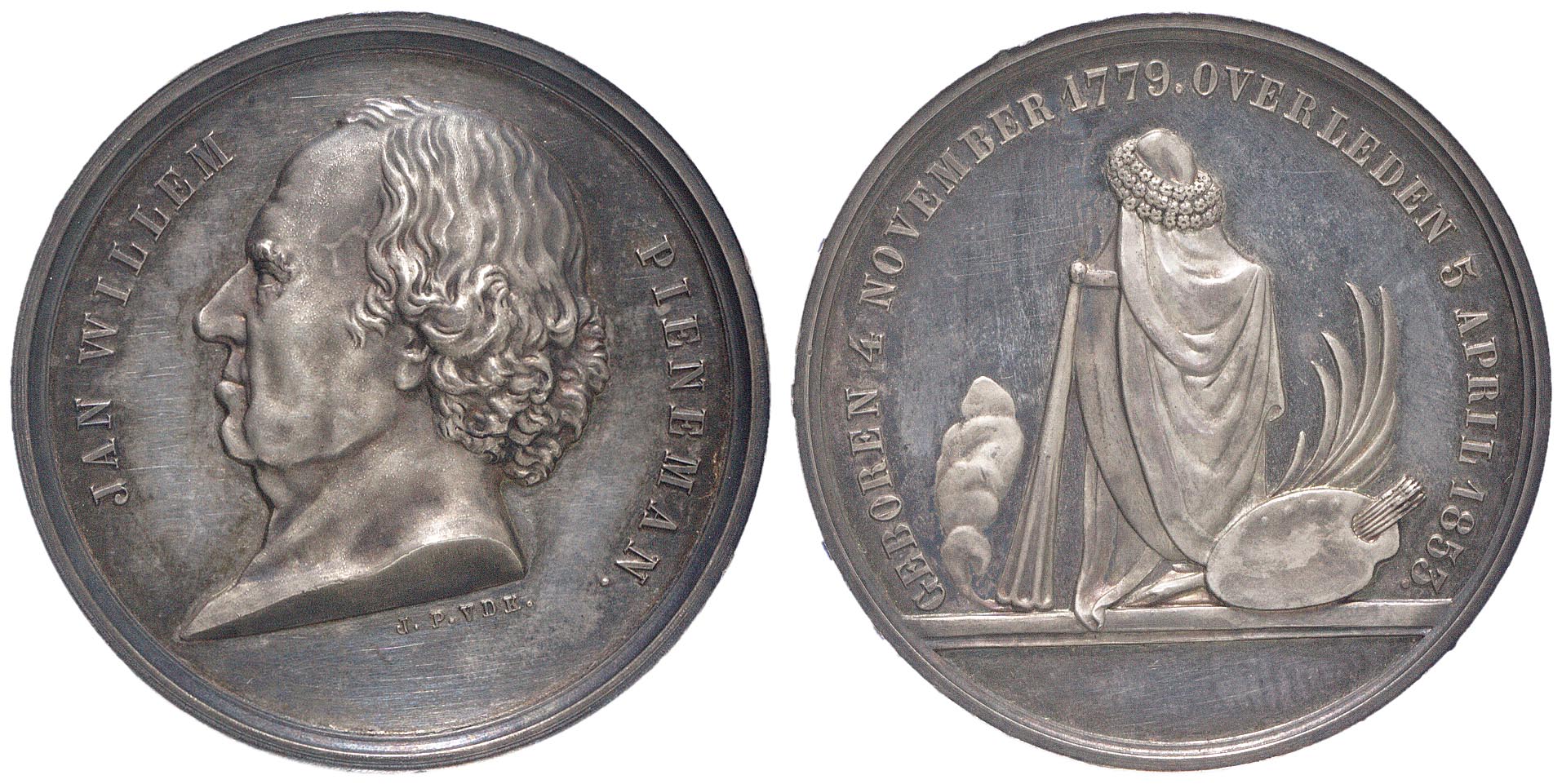 voorzijde: portret en profil van J.W. Pieneman naar links in een omschrift. Onder de schouder een signatuur.