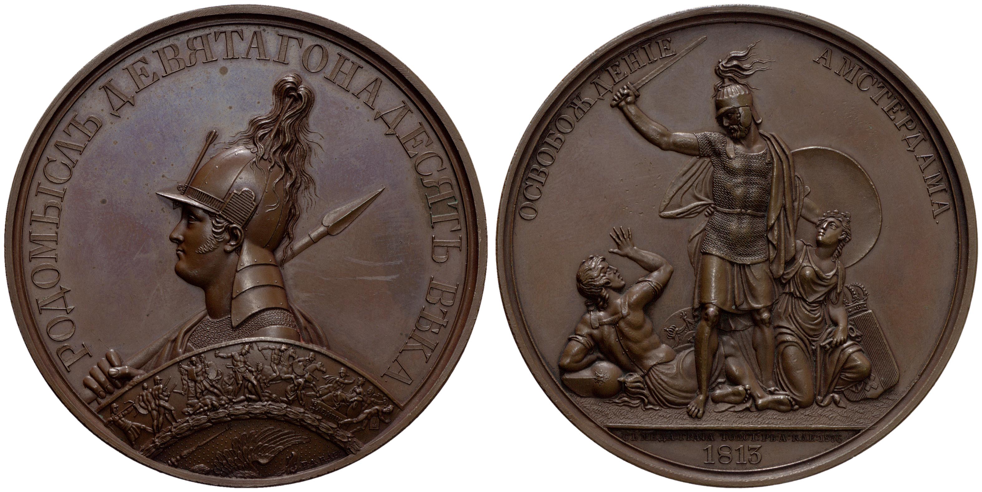 voorzijde: in een omschrift het borstbeeld van Alexander, keizer der Russen, naar links gewend, met harnas, een gepluimde hoge helm met halsstuk en een opstaande pijl op de helmklep, in de rechterhand een spies over de rechter schouder. Met de linkerhand houdt de keizer een rond geciseleerd schild omhoog, met krijgsvolk en ruiters afgebeeld. Gedeeltelijk zichtbaar in het midden op het schild de gekroonde Russische dubbelkoppige keizerlijke adelaar omgeven door een lauwerkrans. Rechtsonder tegen de rand een signatuur. Rechtsonder een banner met jaartal 1813 en een cyrillisch opschrift.