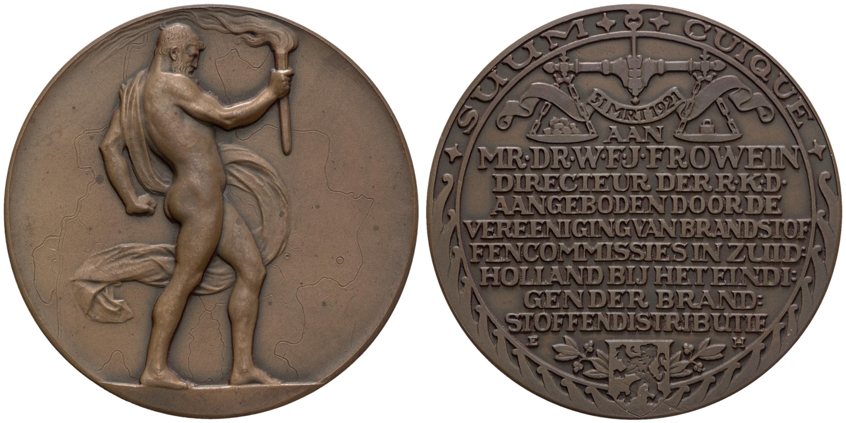 opschrift keerzijde: AAN / MR. DR. W.F.J. FROWEIN / DIRECTEUR DER R.K.D. / AANGEBODEN DOOR DE / VEREENIGING VAN BRANDSTOF / FENCOMMISSIES IN ZUID: / HOLLAND BIJ HET EINDI: / GEN DER BRAND: / STOFFENDISTRIBUTIE