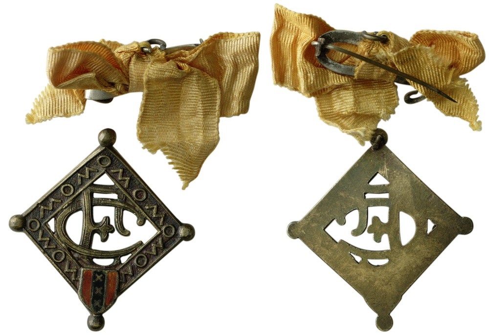 éénzijdig draagteken der feestcommissie aan oranje strik, waarachter een speld voor bevestiging. In een ajour ruit met knoppen aan het eind, een monogram met de letters FC. Onderin de ruit het wapen van Amsterdam in zwart en rood geëmailleerd. In de rand afwisselend een O en een M in serie.