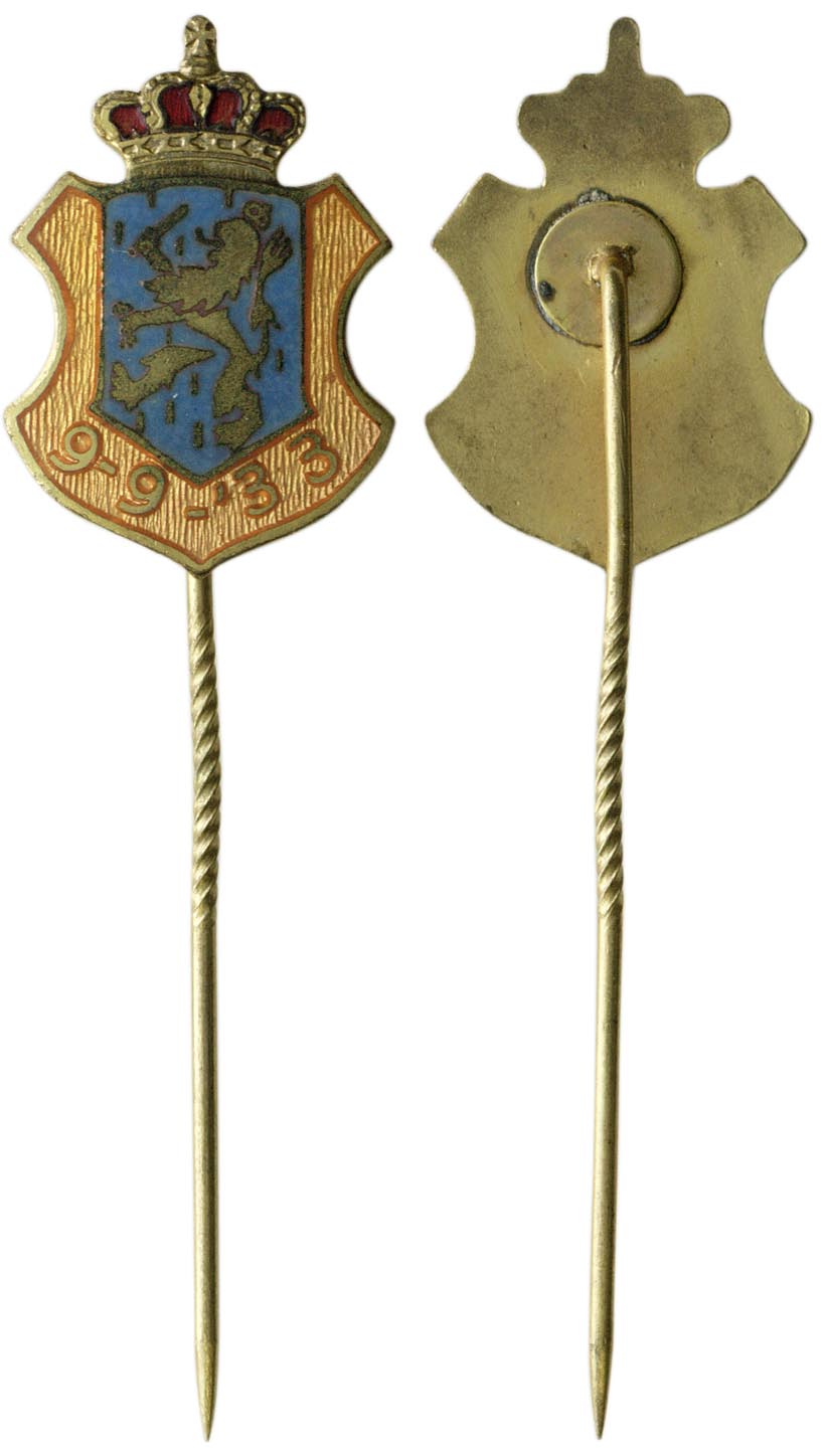 35-jarige regeringsjubileum van Koningin Wilhelmina, huldebetoging in het stadion, 1933 koper, metaal, email hoogte: 6.0 cm; breedte: 1.7 cm; diepte: 0.5 cm; gewicht: 2.98 gr; datum voorzijde: 9-9-33