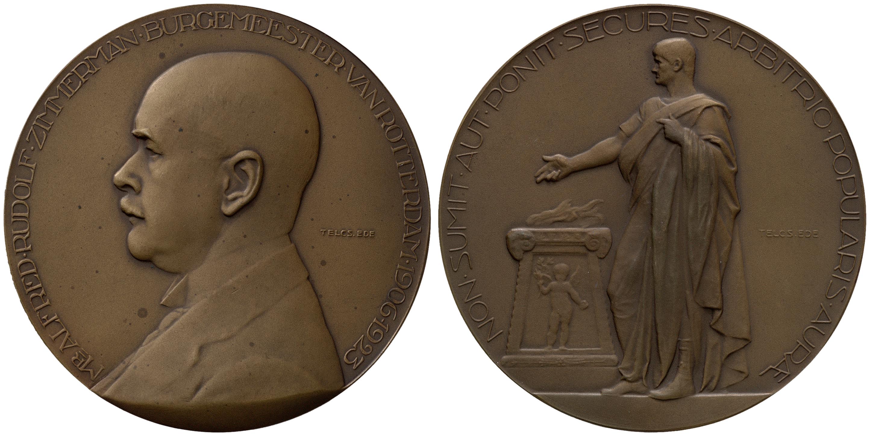 omschrift voorzijde: MR . ALFRED . RUDOLF . ZIMMERMAN . BURGEMEESTER . VAN . ROTTERDAM . 1906 - 1923