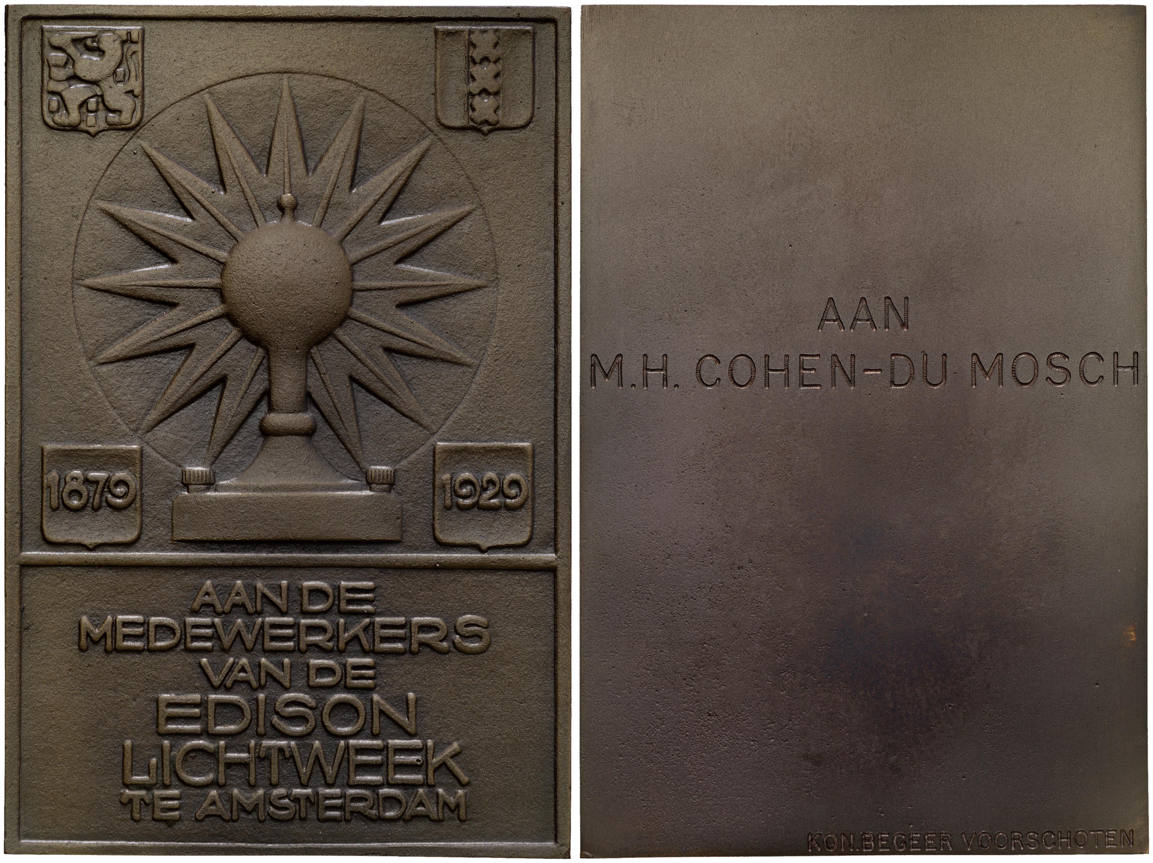 Beeld voorzijde: gloeilamp omgeven door stralen in verdiept cirkelvormig veld, in de vier hoeken schildjes, boven met de wapens van Nederland en Amsterdam, onder met: 1879-1929