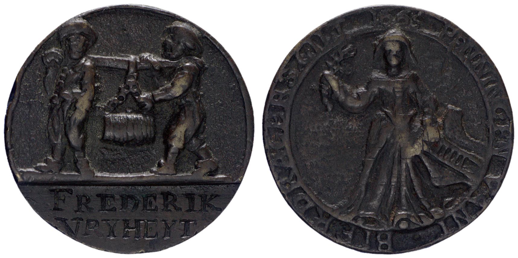 keerzijde: twee mannen links gewend, die een vat dragen aan een draagstok. In de afsnede een naam.