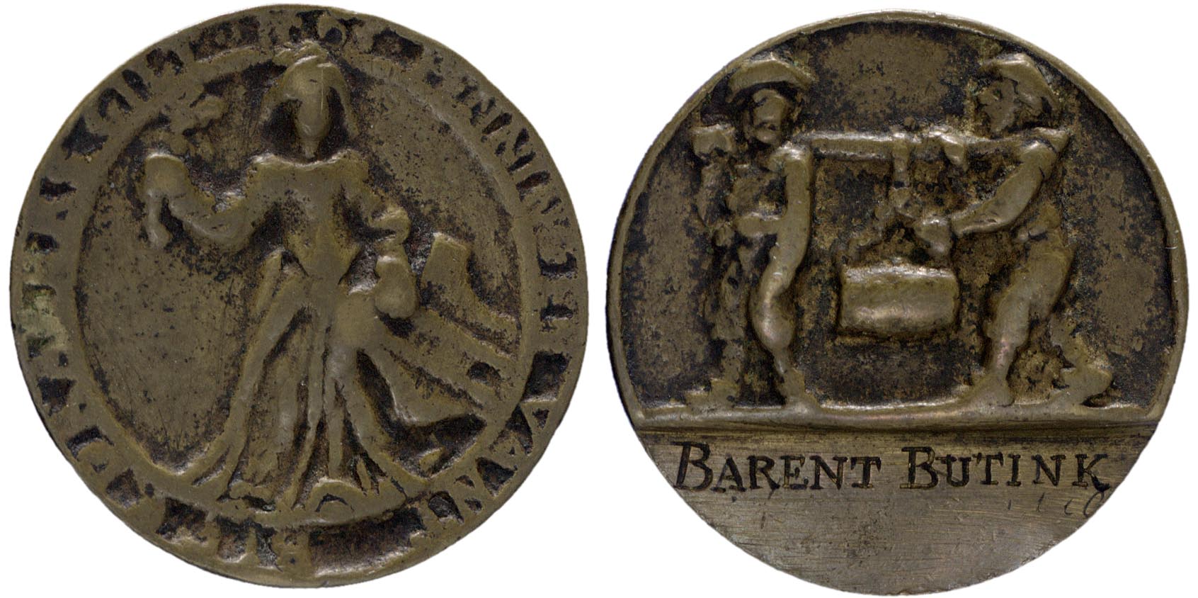 voorzijde: een vrouwenfiguur met in de ene hand een tak hop en in de andere een schild, waarop een draagberrie. keerzijde: twee mannen links gewend, die een vat dragen aan een draagstok. In de afsnede een naam.
