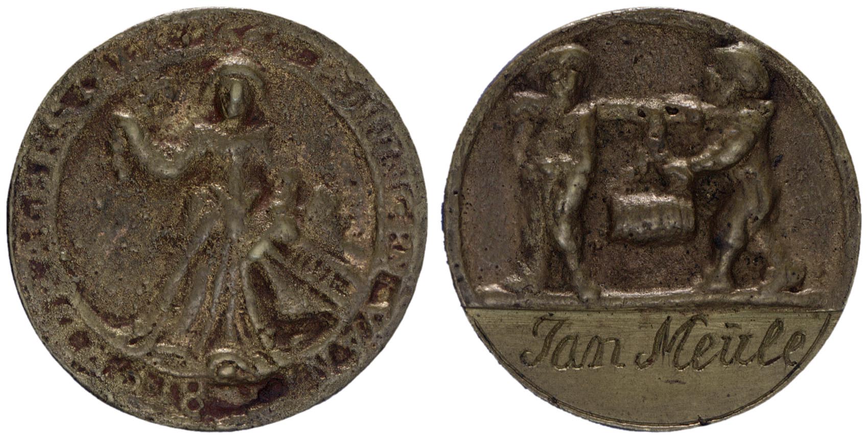 keerzijde: twee mannen links gewend, die een vat dragen aan een draagstok. In de afsnede een naam.