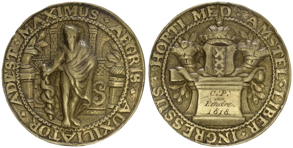 voorzijde: Aesculapius met zijn staf; achter hem een gebouw, links en rechts vazen met planten. Voorzien van een omschrift.