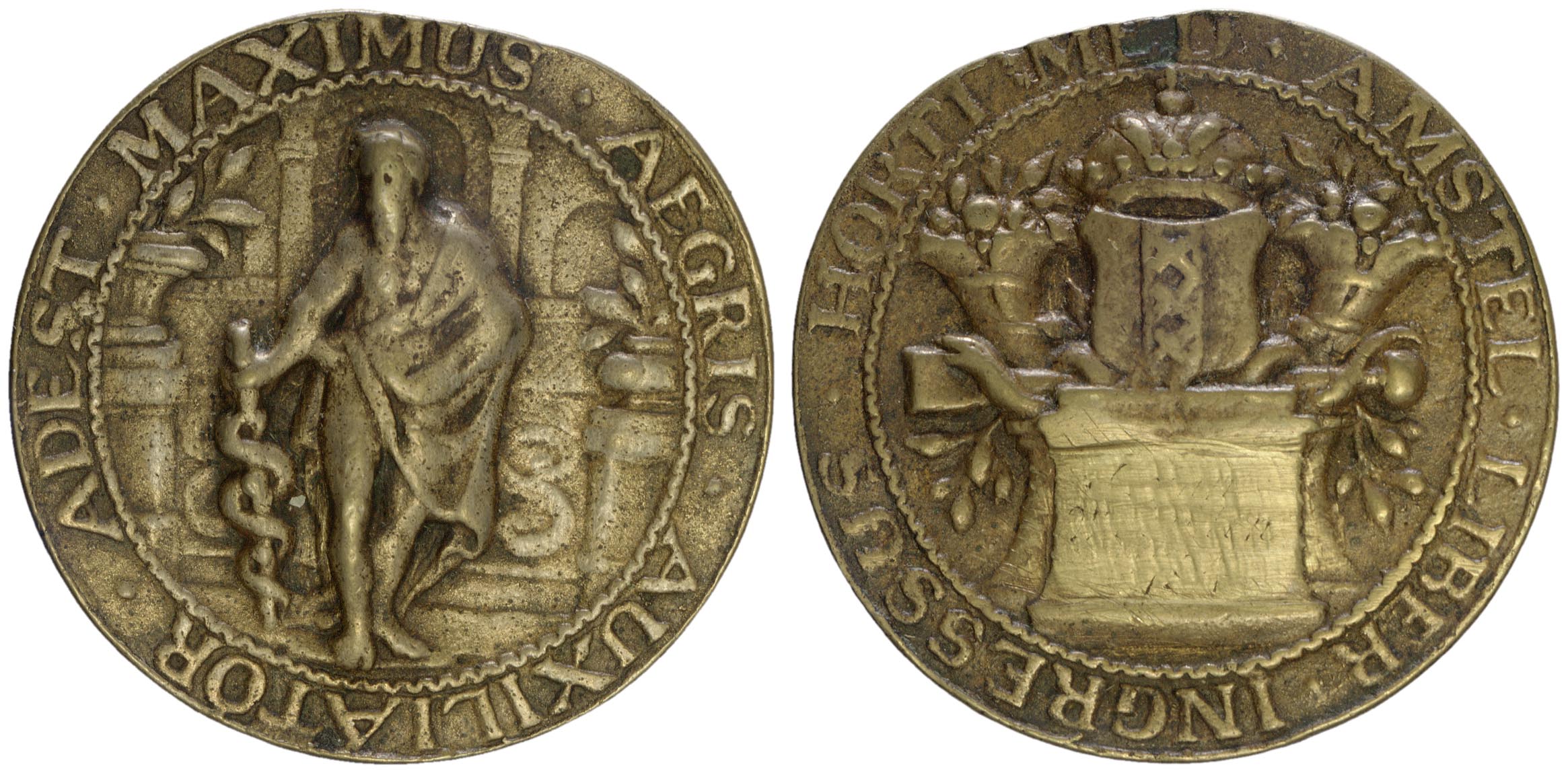 voorzijde: Aesculapius met zijn staf; achter hem een gebouw, links en rechts vazen met planten. Voorzien van een omschrift.