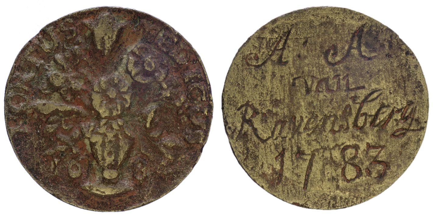 Collegium Medicum toegangspenning Hortus Medicus t.n.v. A.A. van Ravensberg, 1783 (inschrijving als chirurgijns knecht), 1783 koper, metaal hoogte: 2.8 cm; breedte: 2.9 cm; diepte: 0.2 cm; gewicht: 6.40 gr; jaartal voorzijde: 1684