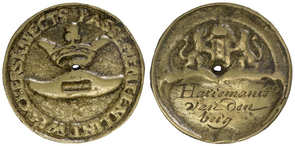 keerzijde: het gekroonde stadswapen van Amsterdam, gehouden door twee leeuwen. Daaronder een veld met een gegraveerde naam. In het midden is de penning doorboord.