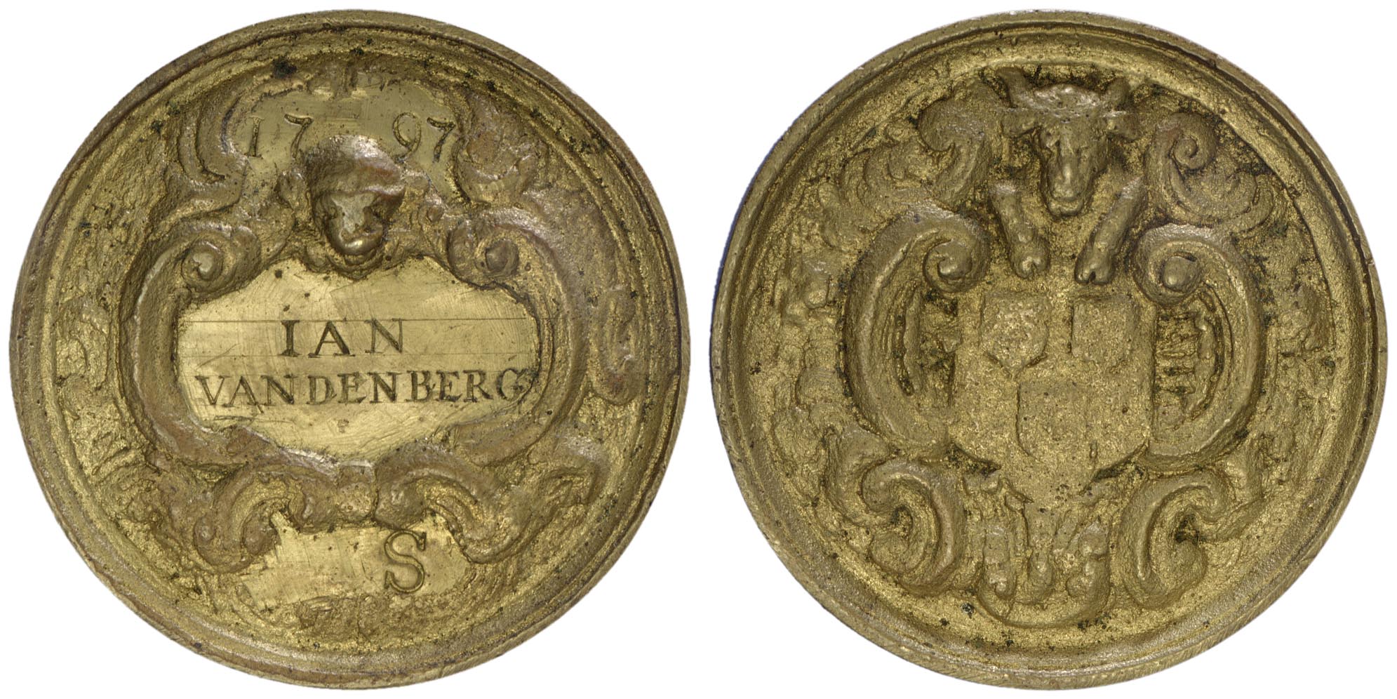 keerzijde: een versierd schild voor een naam. Er boven een doodshoofd. Boven een compartiment voor een jaartal, onder voor de letter van het beroep (B=Beeldhouder; GS=Glazenmaker-Schilder; S=Schilder; SG=Schilder-Glazenmaker). Versierd met Rocaille motieven.