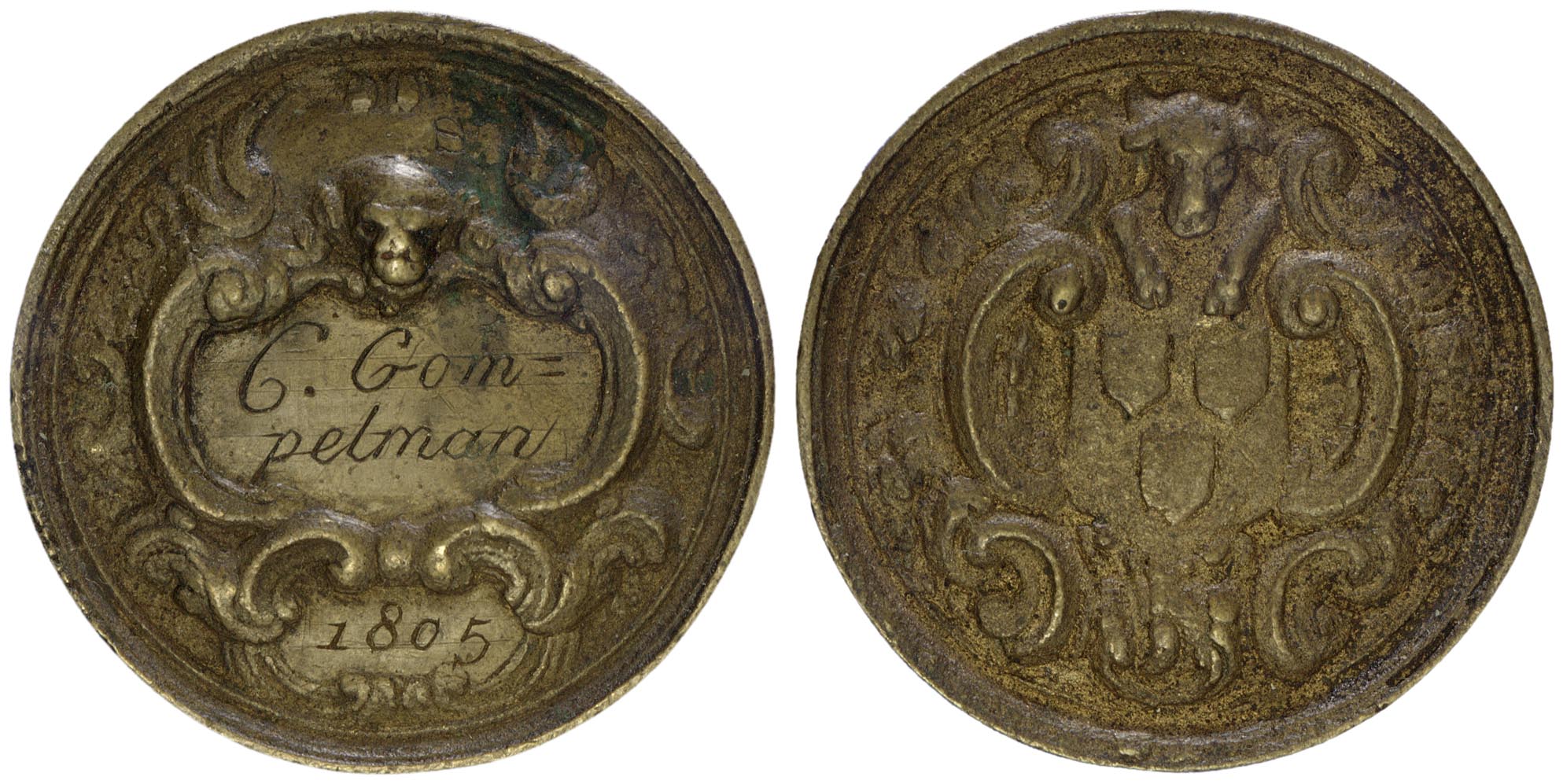 keerzijde: een versierd schild voor een naam. Er boven een doodshoofd. Boven een compartiment voor een jaartal, onder voor de letter van het beroep (B=Beeldhouder; GS=Glazenmaker-Schilder; S=Schilder; SG=Schilder-Glazenmaker). Versierd met Rocaille motieven.