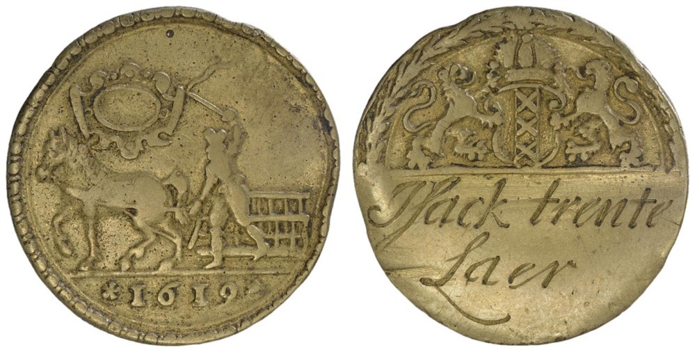 voorzijde: het gekroonde wapen van Amsterdam, gehouden door twee leeuwen, onder de afsnede een veld met naam. Rand met palmkrans (onderhelft weggslepen) keerzijde: een sleper met paard en sleep. Onder de afsnede een jaartal. De rand is versierd.- Trefwoorden