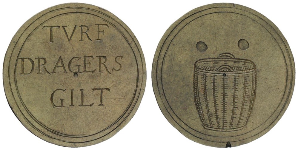 voorzijde: binnen een dubbele cirkelgroef een turfdragersmand. keerzijde: binnen een dubbele cirkelgroef de tekst TVRF DRAGERS GILT.- Trefwoorden