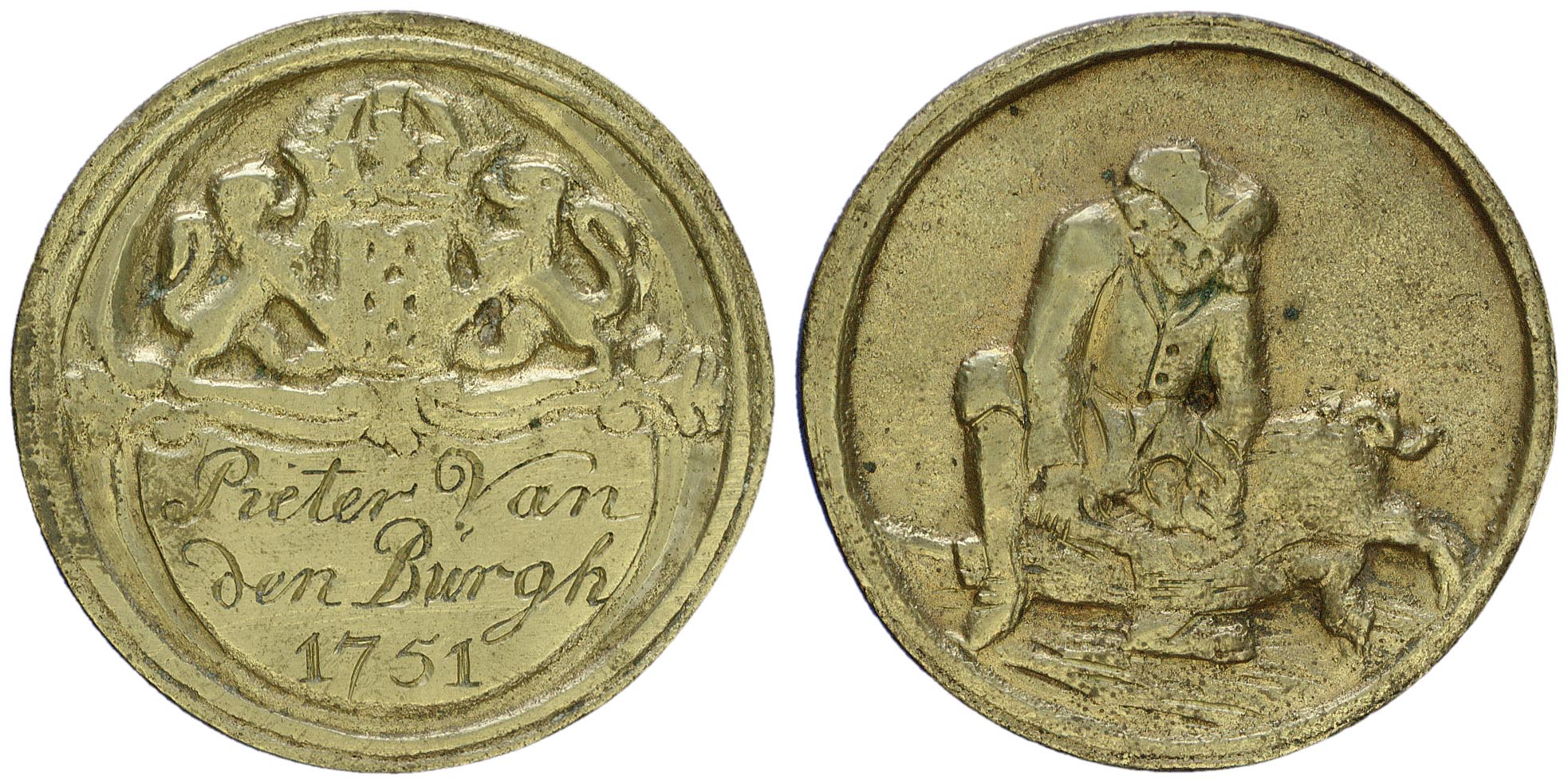 voorzijde: het gekroonde wapen van Amsterdam, gehouden door 2 leeuwen. Daaronder een schild, waarop een naam staat gegraveerd met jaartal.