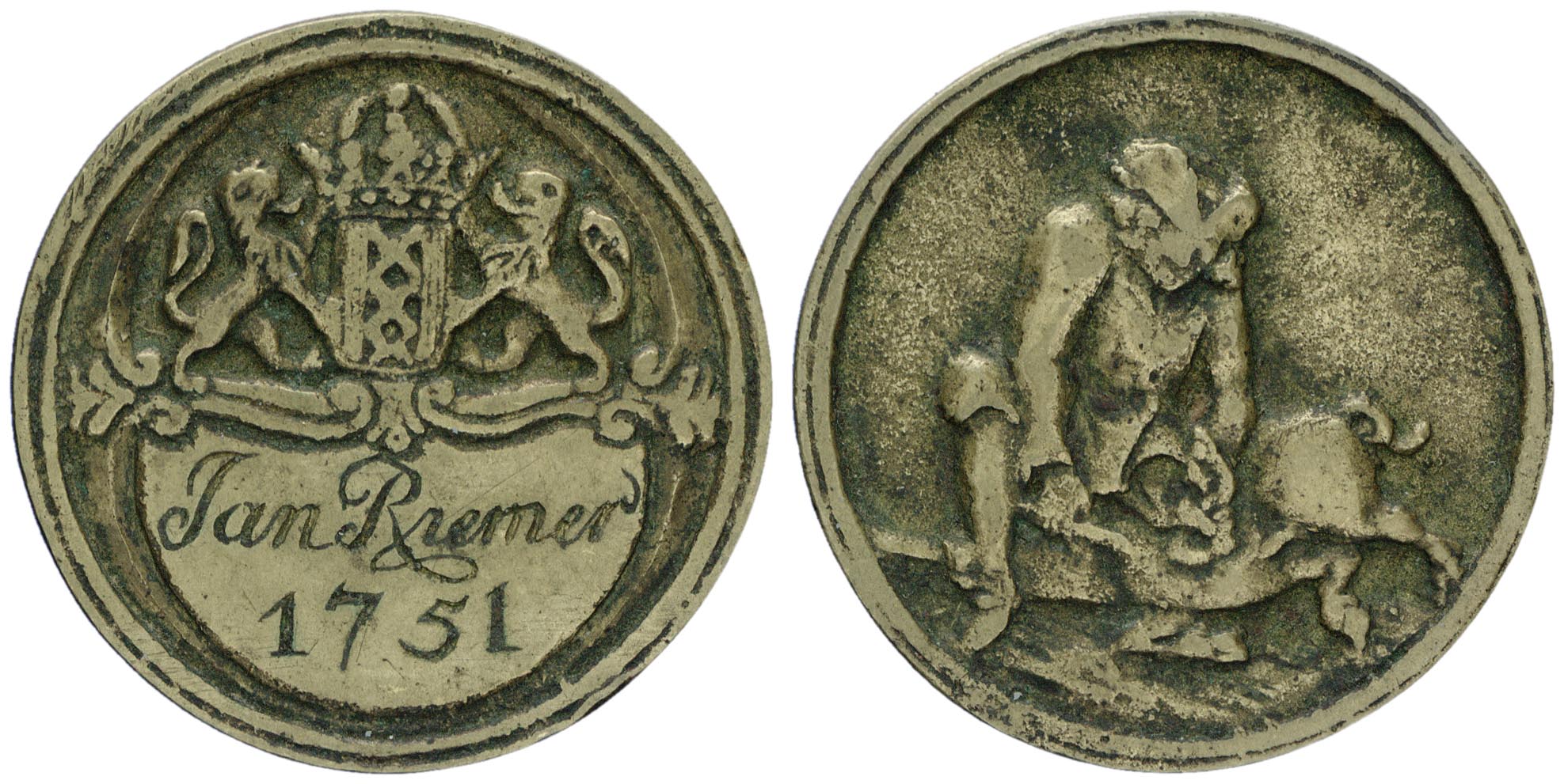 voorzijde: het gekroonde wapen van Amsterdam, gehouden door 2 leeuwen. Daaronder een schild, waarop een naam staat gegraveerd met jaartal.