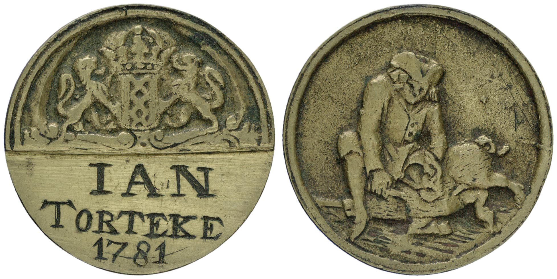 voorzijde: het gekroonde wapen van Amsterdam, gehouden door 2 leeuwen. Onder de afsnede staat een naam en jaartal gegraveerd. keerzijde: een man die een varken slacht.- Trefwoorden