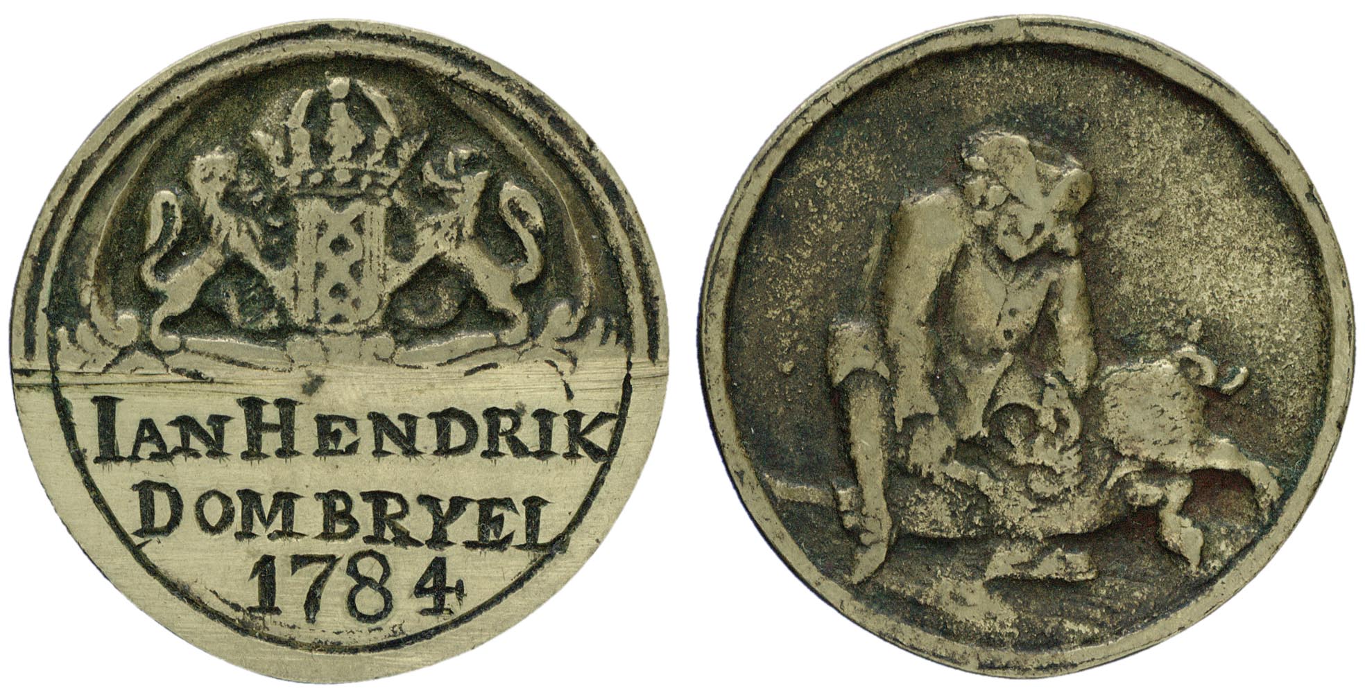 voorzijde: het gekroonde wapen van Amsterdam, gehouden door 2 leeuwen. Daaronder een schild, waarop een naam staat gegraveerd met jaartal.