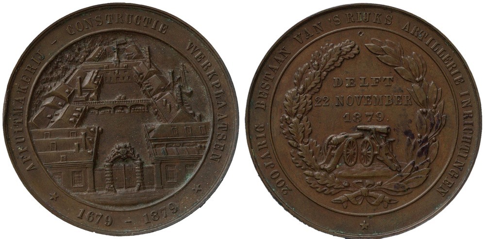 voorzijde: in een omschrift met binnenrand het gebouw van de Rijksartillerie-inrichting in vogelvlucht.