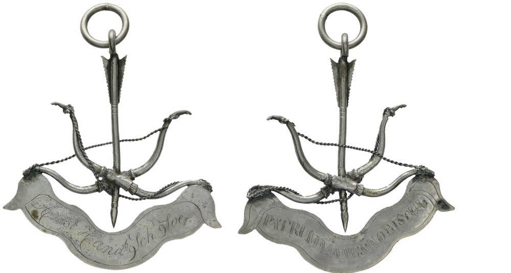 voorzijde: aan een oog met ring een pijl met twee gekruiste handbogen. Eronder een banderolle, waarop een opschrift.