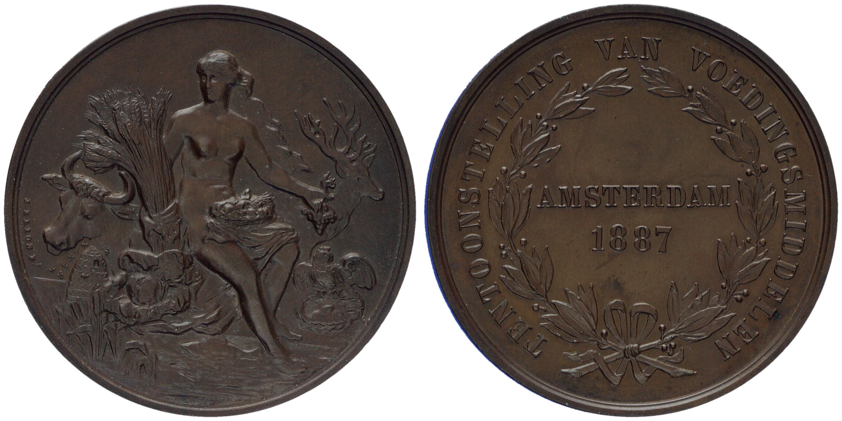 voorzijde: de halfnaakte personificatie van Ceres 'en face' met korenschoof in haar rechterarm, een tros druiven in haar linkerhand, op haar schoot een mand met vruchten. Aan de rechterkant een uil met een nest in zijn poten, links een kool en een bijenkorf, op de achtergrond links een koe en rechts een hert. Geheel links een signatuur.