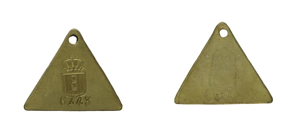 driehoekige penning, aan het boveneind doorboord. voorzijde: het gekroonde wapen van Amsterdam. Onder het wapen een nummer. keerzijde: onbewerkt.- Trefwoorden
