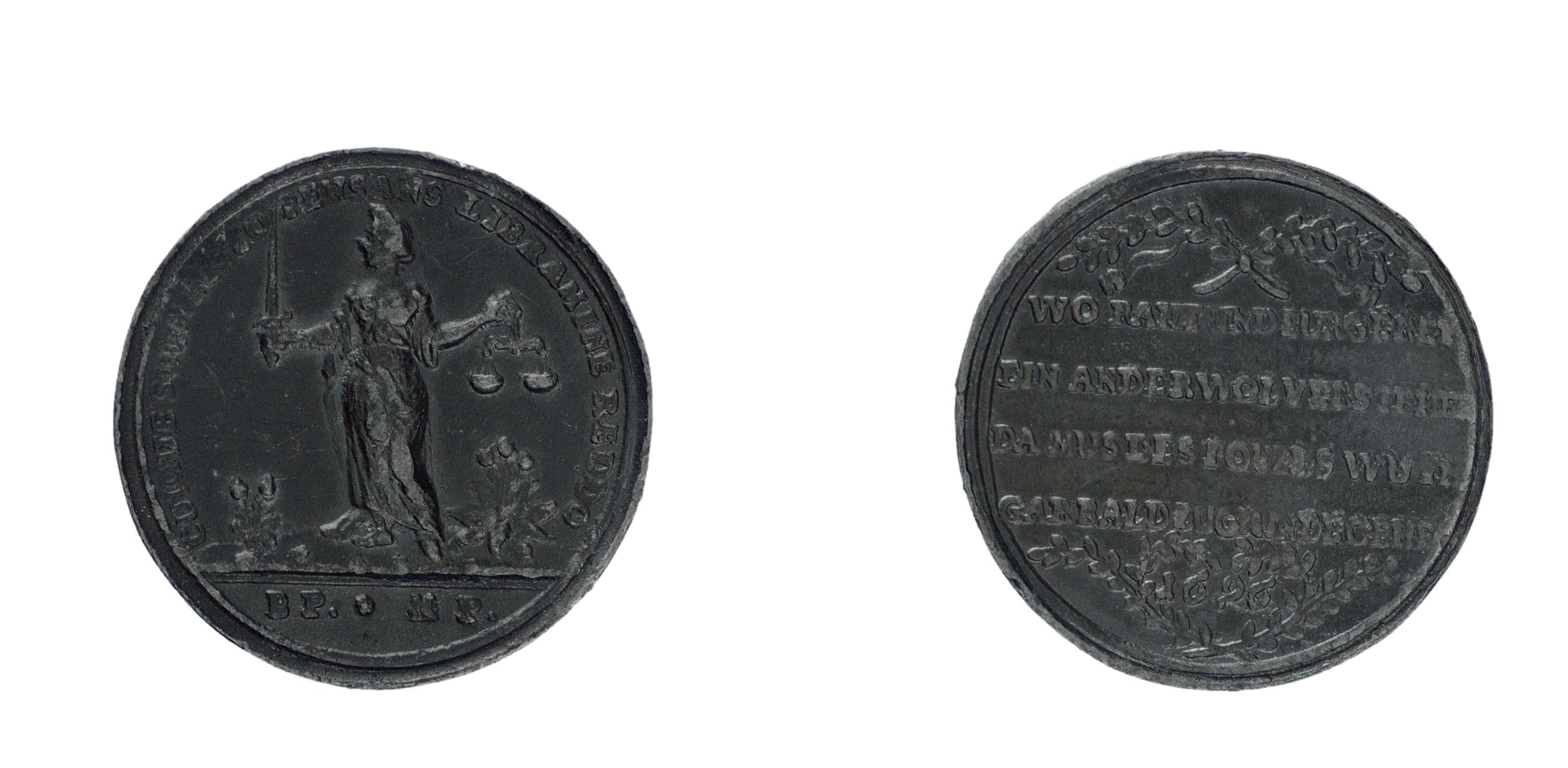 voorzijde: een omschrift; allegorie op de Gerechtigheid in de personificatie van vrouwe Justitia, met in de rechterhand een zwaard en in de linkerhand een weegschaal. Onder de afsnede de initialen van de makers.