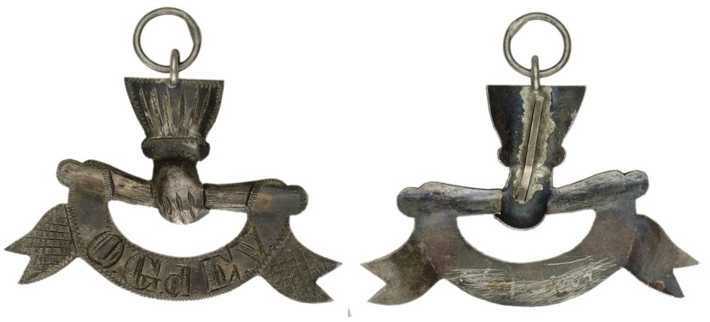 éénzijdig opengewerkt en gegraveerd draagteken: een hand met manchet die een staf vasthoudt waaromheen de beide uiteinden van een lint geslingerd zijn, waaraan links en rechts een wimpel. Op het lint en wimpels een gegraveerde versiering,. Op het lint en de letters O.G.d.E.V. Bovenaan een oog met ring.- Trefwoorden