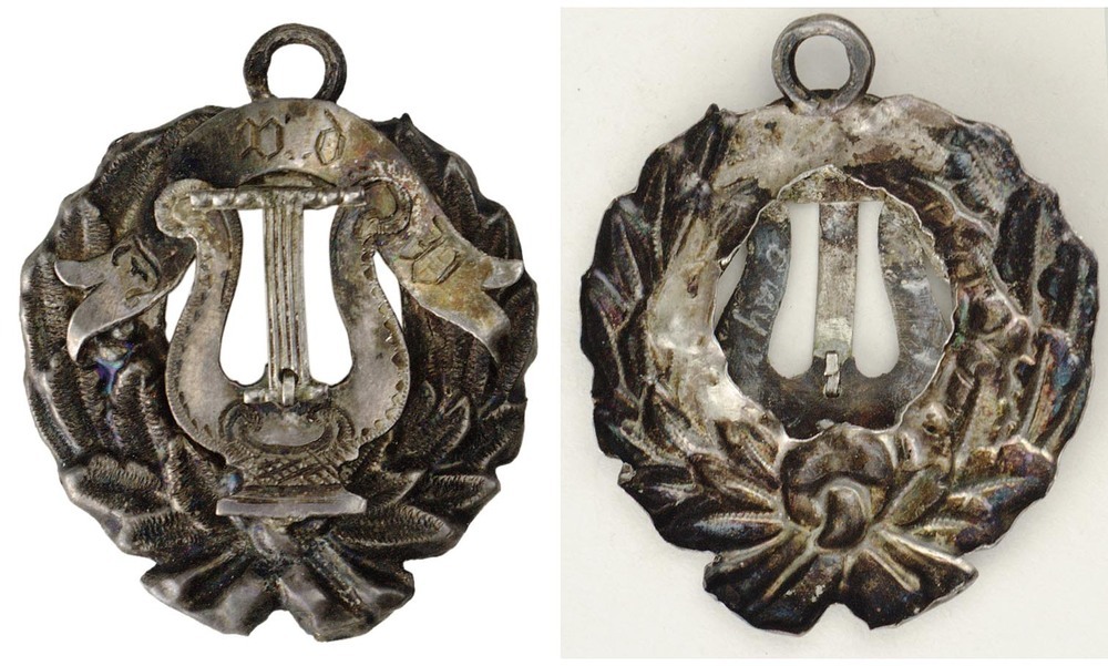 éénzijdig opengewerkt draagteken (ajour bewerkt) met een krans van lauwer- en eikenloof, onderaan gestrikt, rond een lier, waarboven een lint met opschrift. Bovenaan een oog.- Trefwoorden