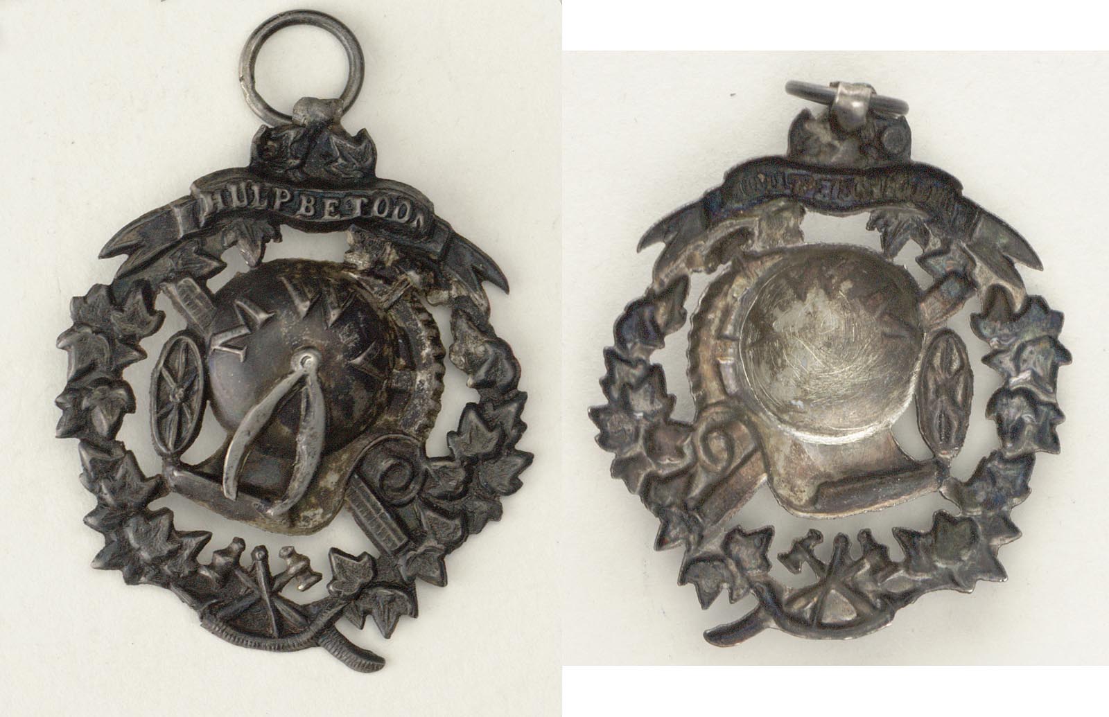 éénzijdig ajour bewerkt draagteken met een krans van klimop-bladeren, waarbinnen een bol met opschrift, omgeven door gereedschappen. Bovenaan een banner met opschrift. Daarboven een oog met ring.- Trefwoorden