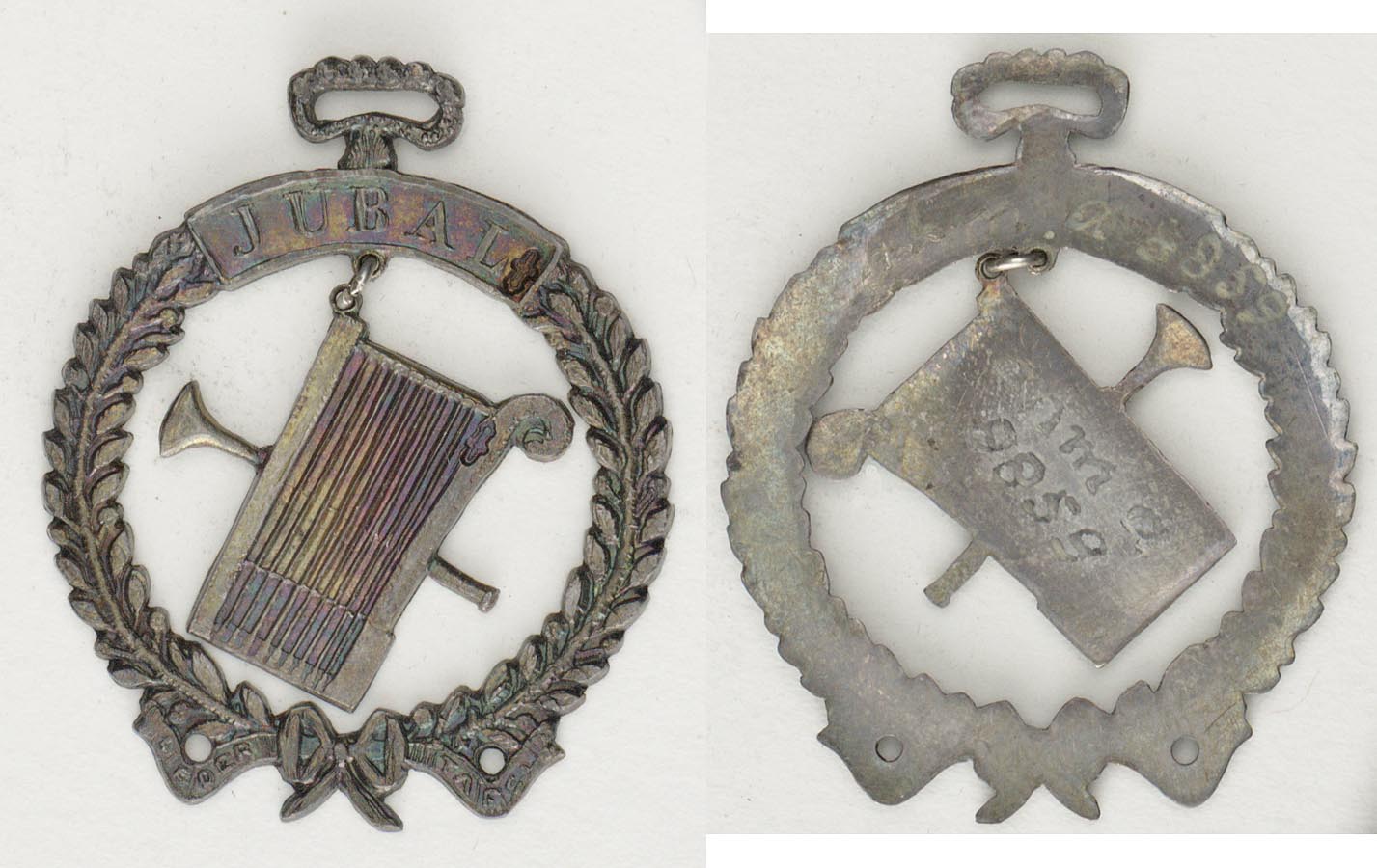éénzijdig ajour bewerkt draagteken in de vorm van een bladerkrans, onderaan gestrikt, binnen aan een oogje een lier en een bazuin. Bovenaan de krans een ovaal oog en een opschrift.