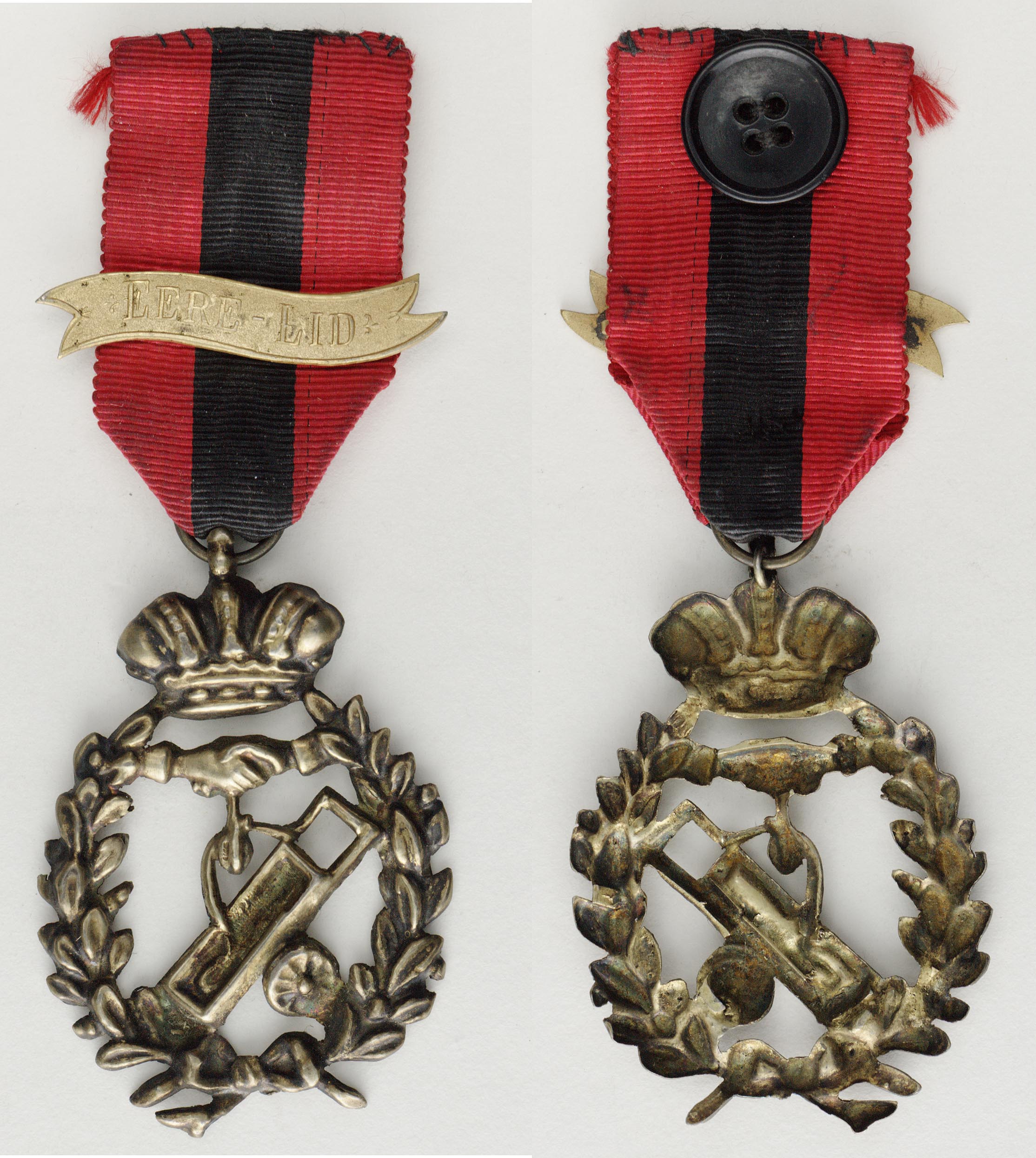 éénzijdig opengewerkt ajour draagteken in de vorm van een gekroonde bladerkrans, onderaan gestrikt. Daarbinnen twee in elkaar gestoken handen; daaronder een blok met een touw en een handkar.Bovenaan de kroon een og waaraan een rood-zwart-rood lint, waarop een plaatje met opschrift.