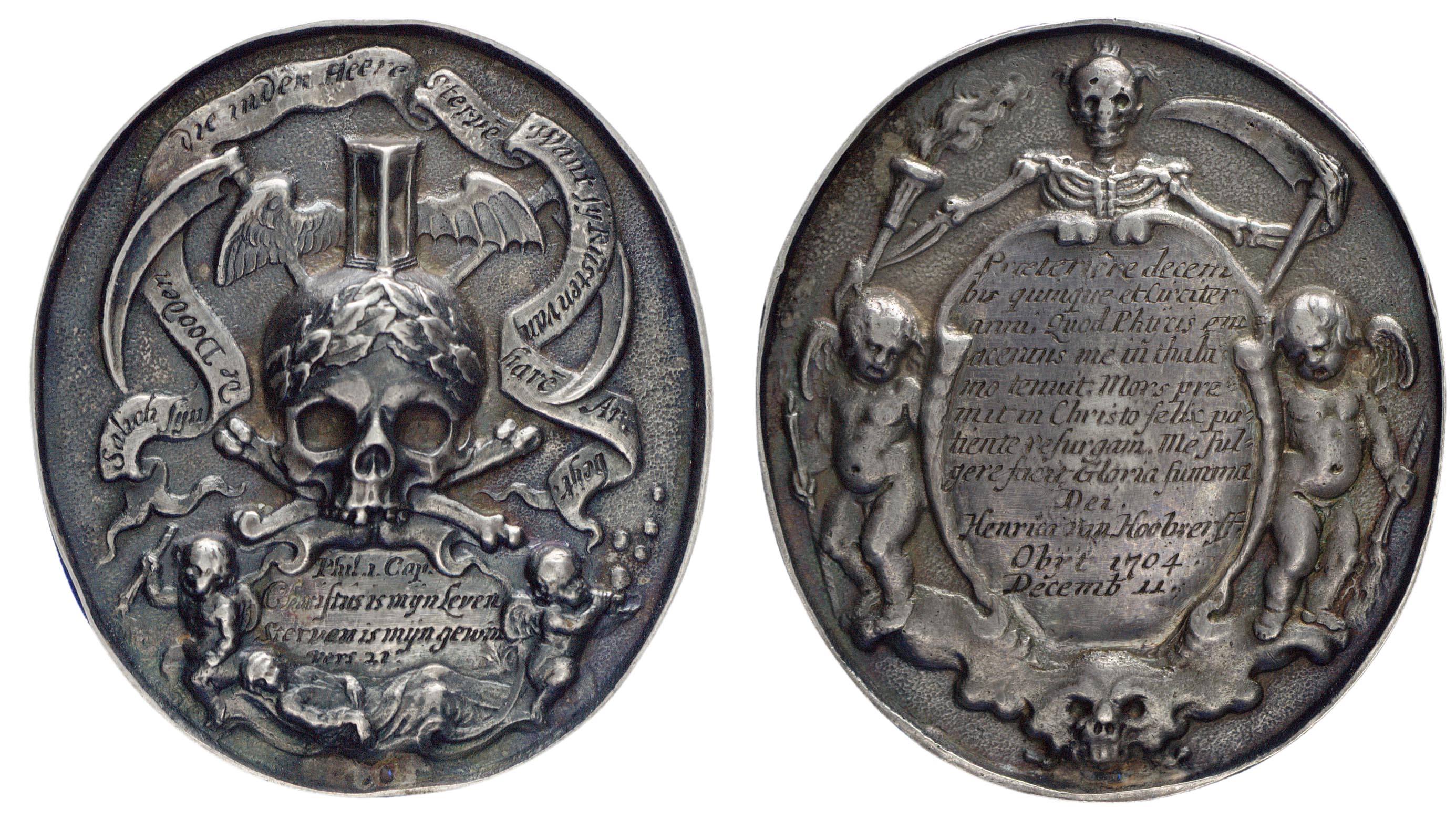 Keerzijde: op een gepointilleerd veld een cartouche met kwabachtig rolwerk dat onderaan uitloopt in een gestileerde vleermuis, op de vleugels daarvan, aanweerzijden van het cartouche, staan twee putti, de linker heeft een brandende fakkel in de in de rechterhand, de rechter met een naar beneden gerichte brandende toorts in de linkerhand. In het cartouche tekst. Bovenaan een geraamde, weergegeven vanaf de borst, met in de rechthand een brandende fakkel en in de linkerhand een zeis. Restanten van haar steken op de schedel.