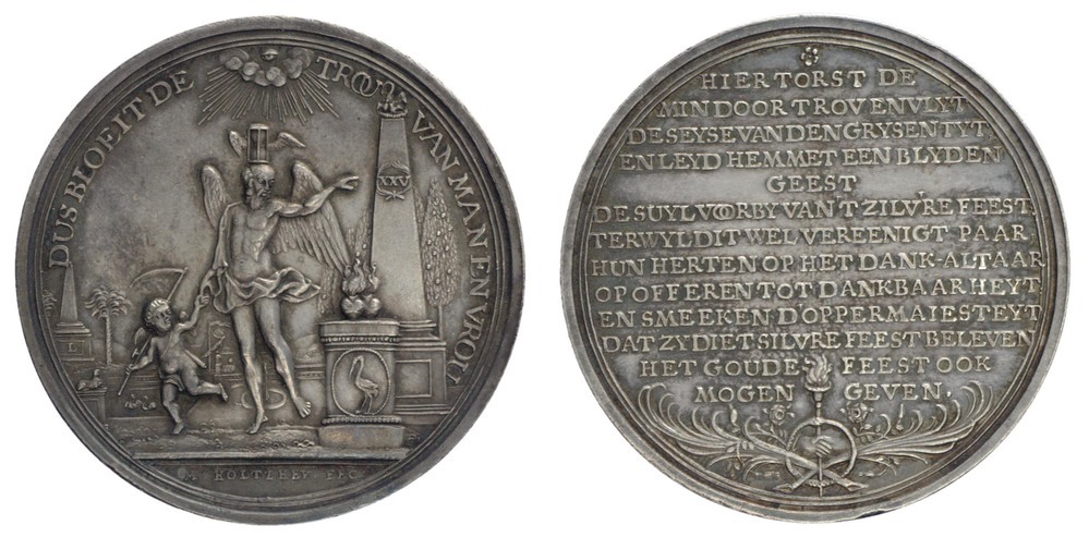 opschrift keerzijde: HIER TORST DE / MIN DOOR TROU EN VLYT / DE SEYSE VAN DEN GRYSEN TYT /, EN LEYD HEM MET EEN BLYDEN / GEEST / DE SUYL VOORBY VAN 'T ZILVRE FEEST / TERWYL DIT WEL VEREENIGT PAAR / HUN HERTEN OP HET DANK-ALTAAR / OPOFFEREN TOT DANKBAARHEYT / EN SMEEKEN D'OPPERMAJESTEIT / DAT ZY DIE 'T ZILVRE FEEST BELEVEN / HET GOUDE FEEST OOK / MOGEN GEVEN.
