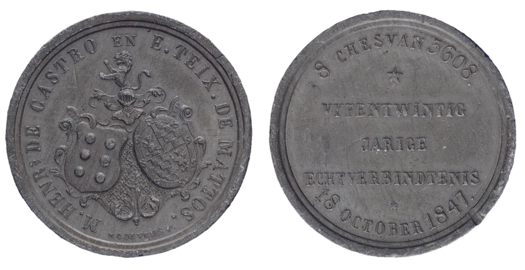 opschrift keerzijde: 8 CHESVA 5608 / * / VIJFENTWINTIG / JARIGE / ECHTVERBINTENIS / 18 OCTOBER 1847.
