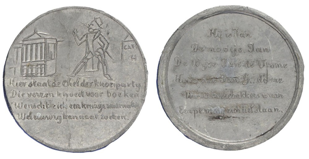 opschrift keerzijde: Hij is Jan, / De mooije Jan, / De wijze Jan de Vrome, / Hij is die Jan G...dome / Wiens koekebakkerswaan / Een penning zich liet slaan.