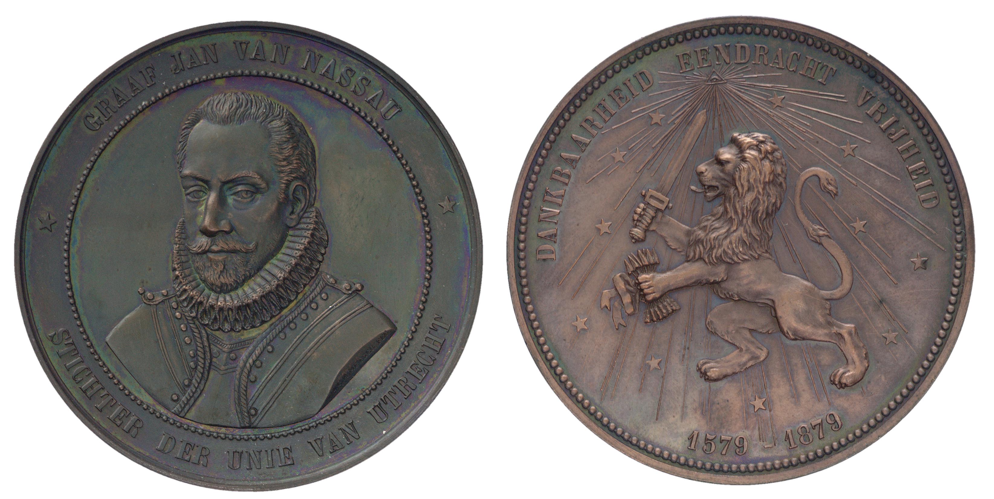 omschrift keerzijde: DANKBAARHEID EENDRACHT VRIJHEID / 1579 - 1879