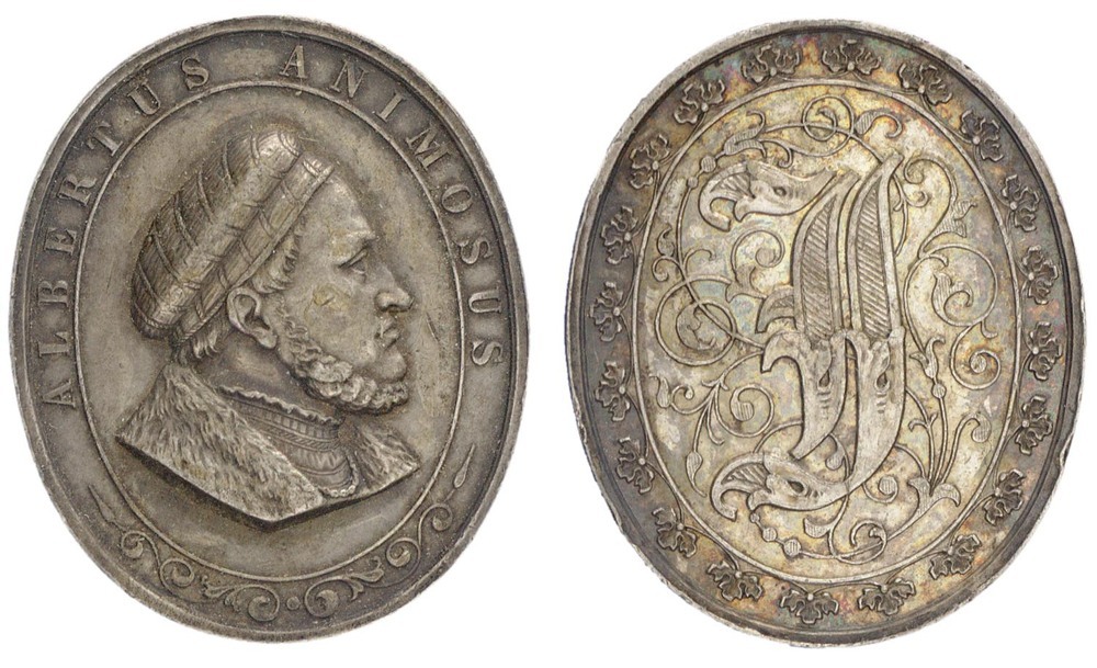 voorzijde: een ovale penning met omschrift waarbinnen het naar rechts gewend portret van Albertus Animosus met baret. Onderaan in de rand versierd met arabesken.