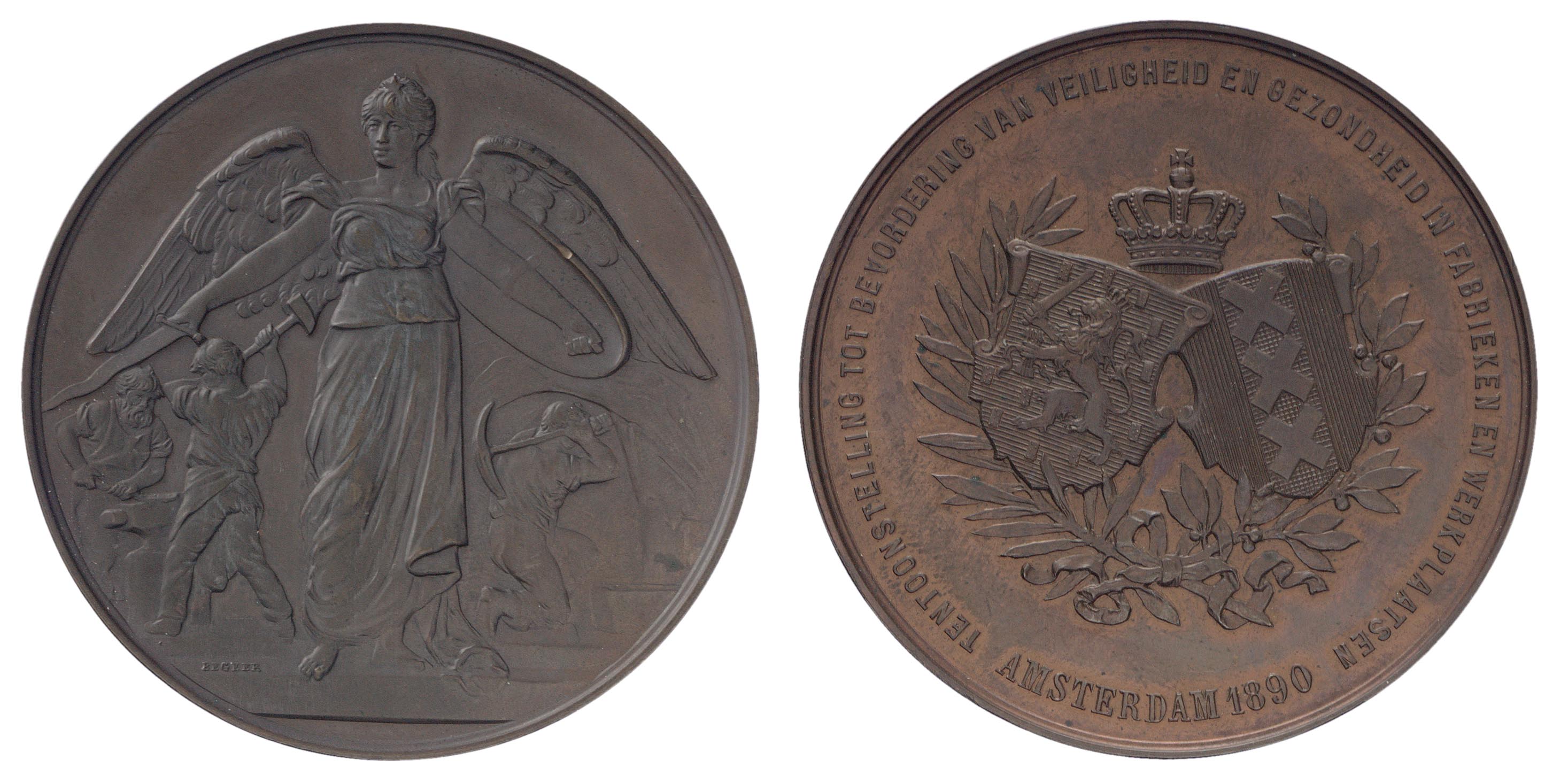 omschrift keerzijde: TENTOONSTELLING TOT BEVORDERING VAN VEILIGHEID EN GEZONDHEID IN FABRIEKEN EN WERKPLAATSEN / AMSTERDAM 1890