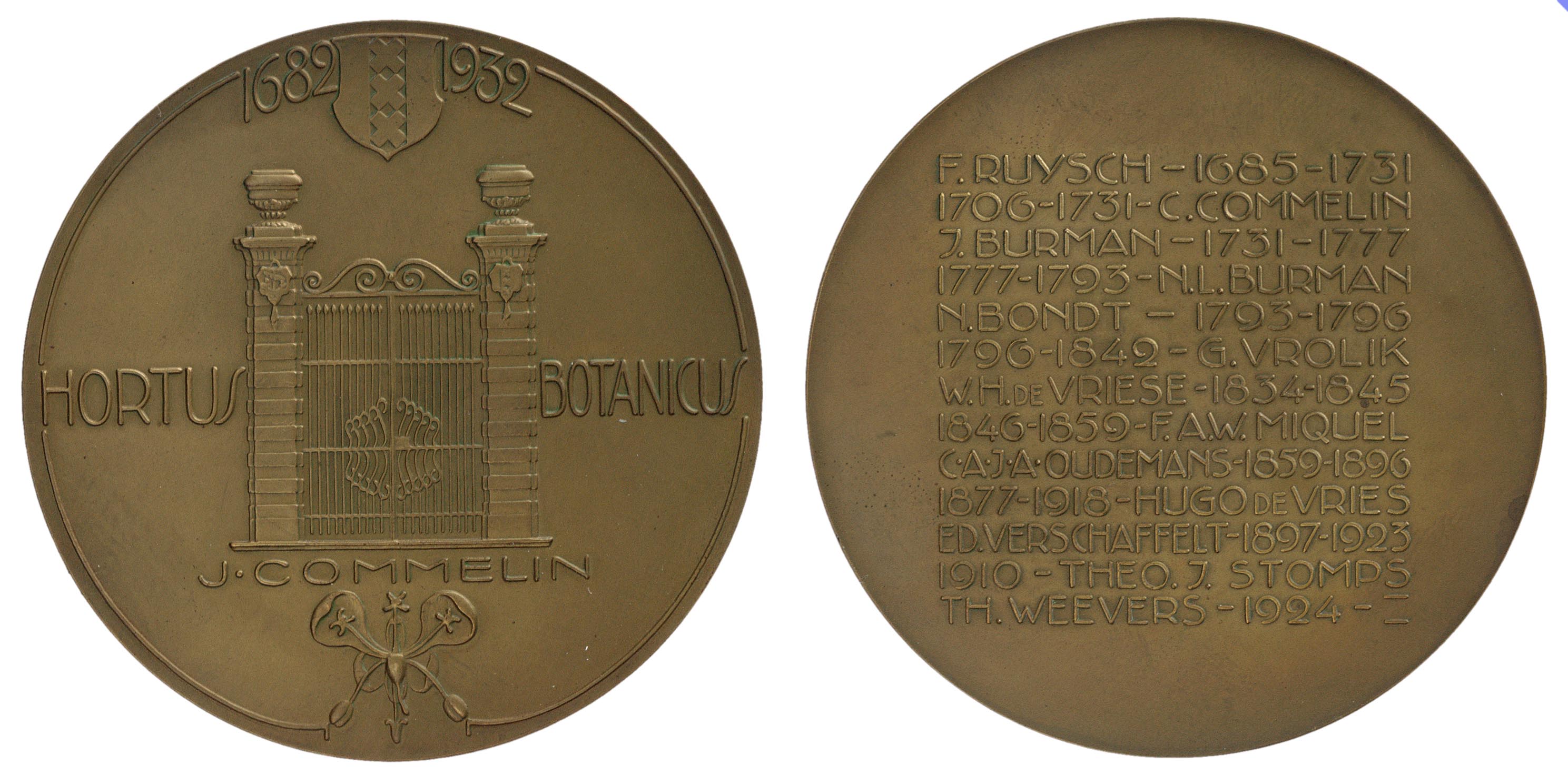 Voorzijde: het oude getraliede toegangshek tussen twee pylonen van de Hortus Botanicus. Daarboven het stadswapen van Amsterdam tussen de jaartallen 1682 en 1932; links en rechts van het hek een opschrift. Daaronder een opschrift. Midden onder een ornament.