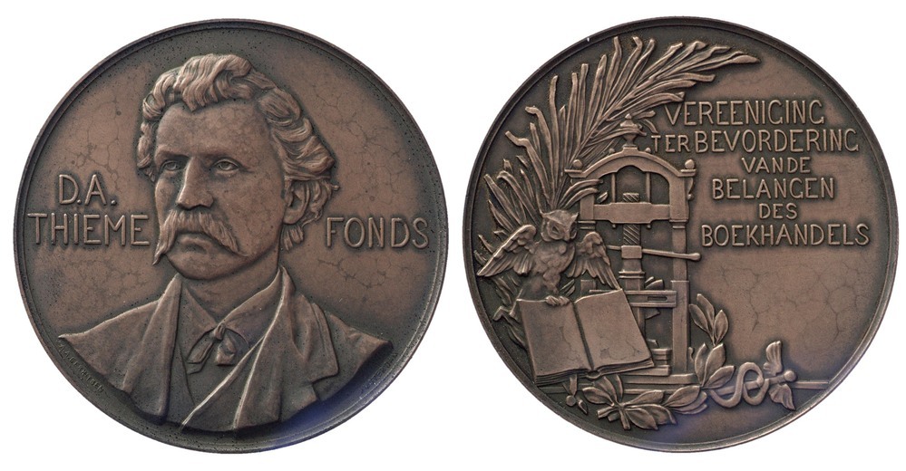 voorzijde: borstbeeld van D.A. Thieme schuin naar links, met opschrift. Linksonder een signatuur.