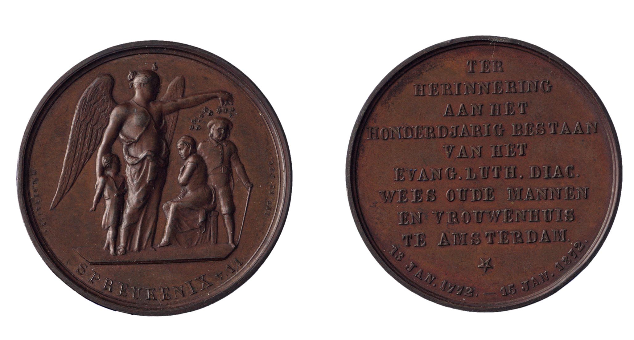 opschrift keerzijde: TER HERINNERING / AAN HET HONDERD JARIG BESTAAN VAN HET EVANG. LUTH. DIAC. WEES OUDE MANNEN EN VROUWENHUIS TE AMSTERDAM.