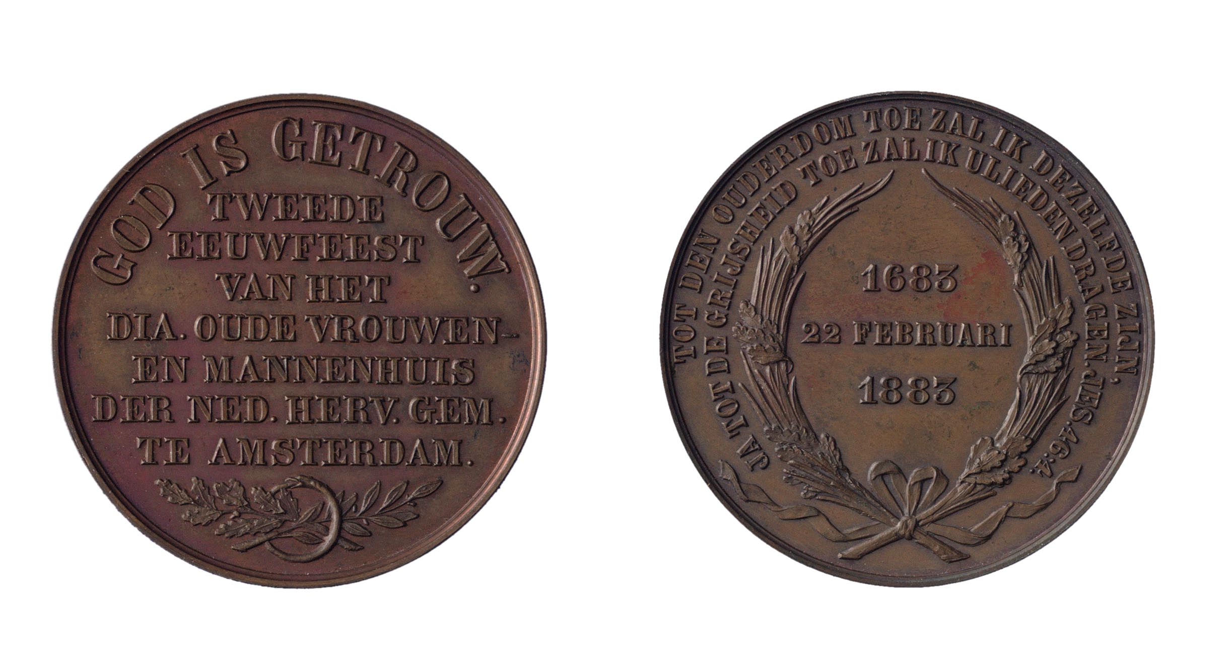 opschrift voorzijde: TWEEDE / EEUWFEEST / VAN HET / DIA. OUDEVROUWEN- / EN MANNENHUIS / DER NED. HERV. GEM. / TE AMSTERDAM.