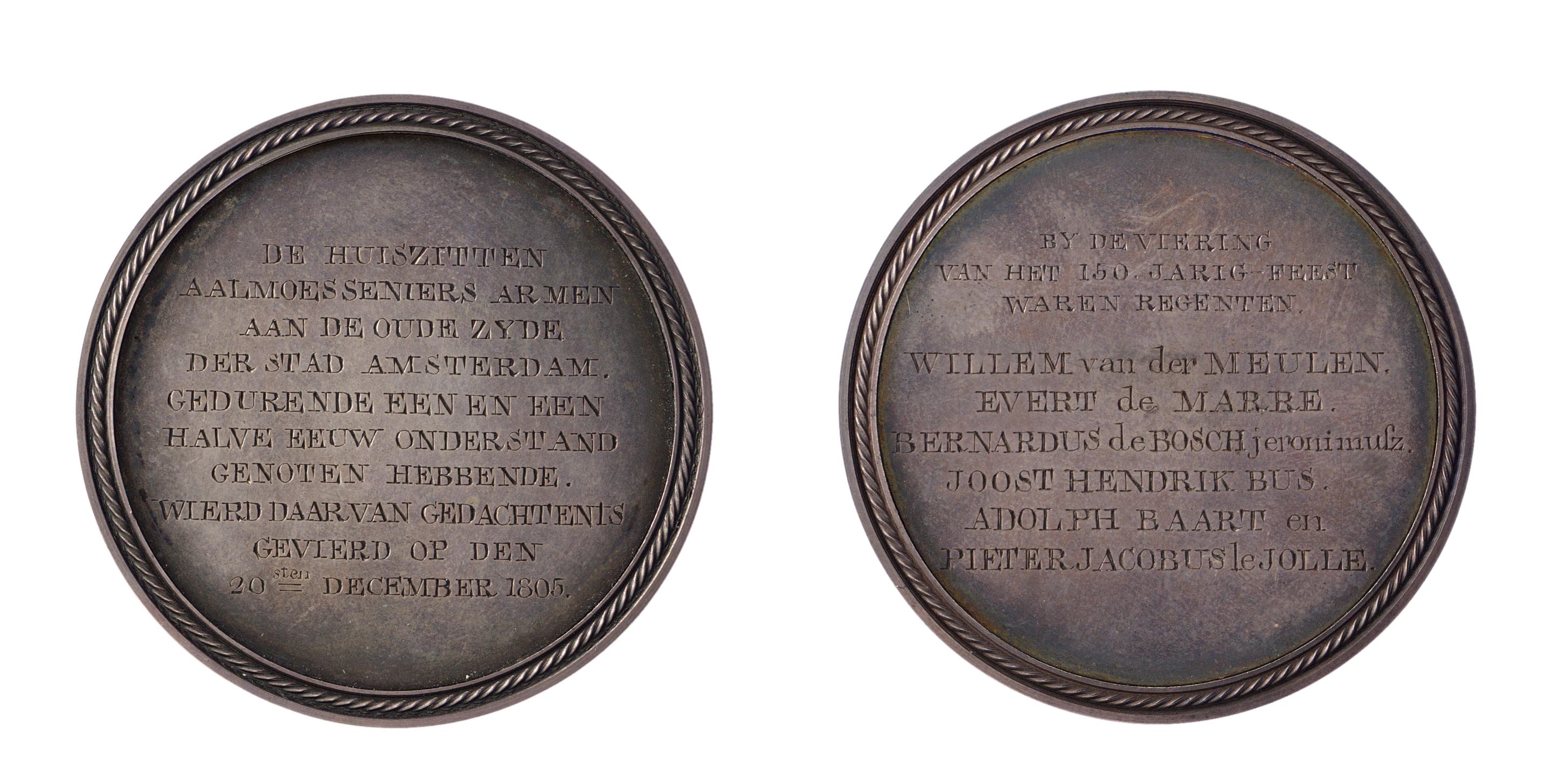 opschrift voorzijde: DE HUISZITTEN / AALMOESSENIERS ARMEN / AAN DE OUDE ZYDE / DER STAD AMSTERDAM. / GEDURENDE EEN EN EEN / HALVE EEUW ONDERSTAND / GENOTEN HEBBENDE. / WIERD DAARVAN GEDACHTENIS / GEVIERD OP DEN / 20STEN DECEMBER 1805.